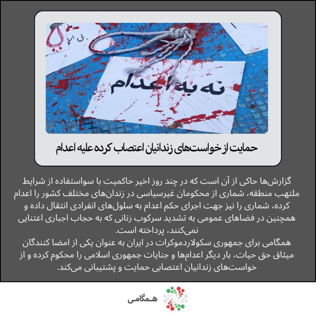 همگامی برای جمهوری سکولاردموکرات در ایران به عنوان یکی از امضا کنندگان میثاق حق حیات، بار دیگر اعدامها و جنایات جمهوری اسلامی را محکوم کرده و از خواستهای زندانیان اعتصابی حمایت و پشتیبانی میکند.