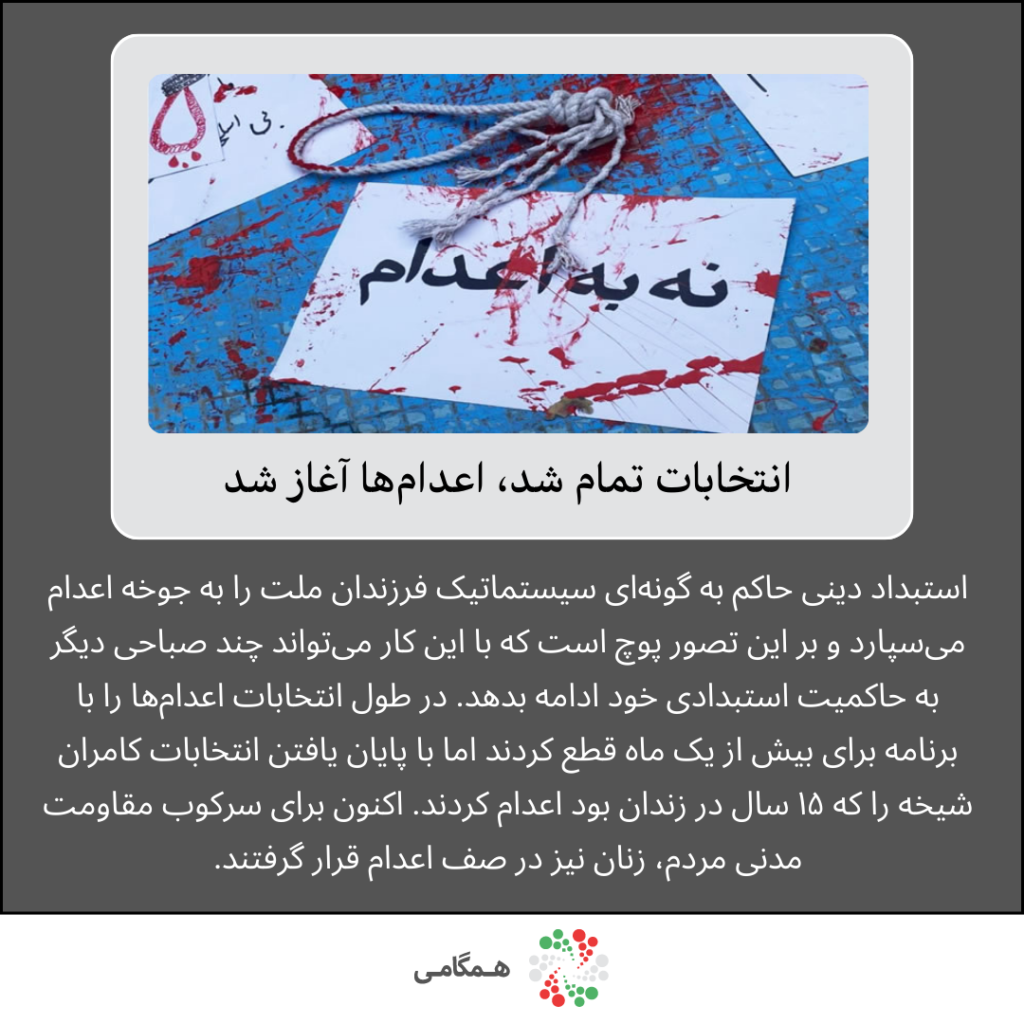 استبداد دینی حاکم به گونهای سیستماتیک فرزندان ملت را به جوخه اعدام میسپارد و بر این تصور پوچ است که با این کار میتواند چند صباحی دیگر به حاکمیت استبدادی خود ادامه بدهد. در طول انتخابات اعدامها را با برنامه برای بیش از یک ماه قطع کردند اما با پایان یافتن انتخابات کامران شیخه را که ۱۵ سال در زندان بود اعدام کردند. اکنون برای سرکوب مقاومت مدنی مردم، زنان نیز در صف اعدام قرار گرفتند. علاوه بر شریفه محمدی اکنون پخشان عزیزی و نسیم غلامی سیمیاری حکم اعدام گرفتند. مقابله مشترک همه آزادیخواهان علیه سرکوب، زندان و اعدام امری شدنی است. همگامی کوشش رژیم برای ایجاد جو ترور و وحشت را به شدت محکوم میکند و بر اساس میثاق حق زندگی خواهان پایان دادن به مجازات ضد انسانی اعدام است.
