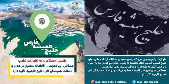 اظهارات رئیسجمهور آمریکا در مورد بررسی استفاده از نام جعلی برای خلیج فارس، اقدامی خلاف واقعیات تاریخی و خلاف نام گذاری سازمان ملل و توهینی آشکار به ملت ایران و منافی تمامیت ارضی ایران است.