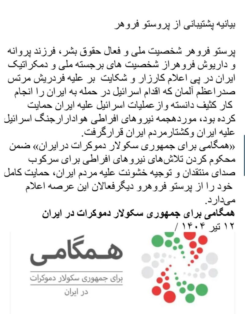 بیانیه همگامی در پشتیبانی از پرستو فروهر 12. July 2025 همگامی برای جمهوری سکولار دموکرات در ایران» ضمن محکوم کردن تلاش های نیرو های افراطی برای سرکوب صدای منتقدان و توجیه خشونت علیه مردم ایران، حمایت کامل خود را از پرستو فروهر و دیگر فعالان این عرصه اعلام می دارد. «همگامی برای جمهوری سکولار دموکرات در ایران» ۱۲ تیر ۱۴۰۴