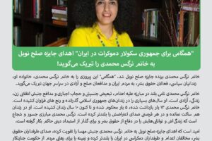 “همگامی” این پیروزی را به خانم نرگس محمدی، خانواده او، زندانيان سياسی، فعالان حقوق بشر، به مردم ایران و مدافعان صلح و آزادی در سراسر جهان تبريک می‌گويد.    خانم نرگس محمدی نامی بلند در مبارزه عليه اعدام، تبعيض جنسيتی و حجاب اجباری و مدافع جنبش انقلابی زن، زندگی، آزادی است. او سال های بسیاری را در زندان های جمهوری اسلامی گذرانده